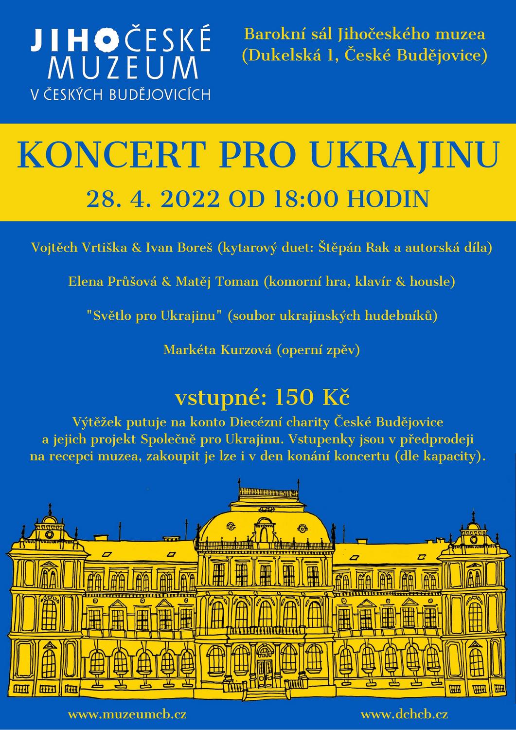 Zveme Vás na charitativní koncert pro Ukrajinu, který se koná ve čtvrtek 28. dubna 2022 od 18:00 hodin v Barokním sále hlavní budovy Jihočeského muzea v Českých Budějovicích. Agrese ze strany Ruska na Ukrajině bohužel nekončí a válečným konfliktem je postiženo stálé více nevinných lidí, kteří ze země prchají a hledají útočiště a bezpečné zázemí. Veškerý výtěžek z koncertu poputuje na účet Diecézní charity České Budějovice, která peníze využije na pomoc Ukrajincům na jihu Čech.