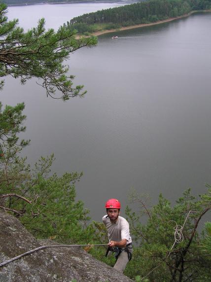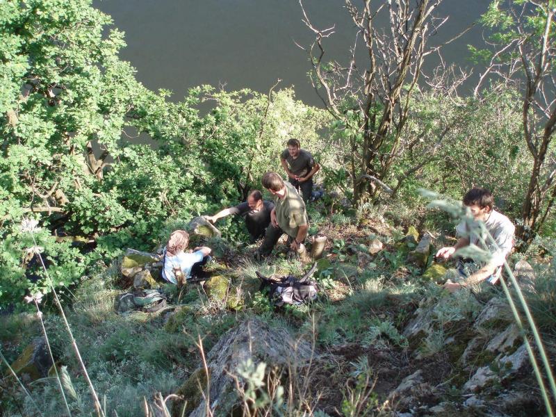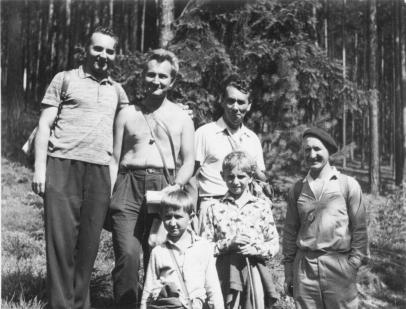 Zátopové území na Otavě u Vráže 18. 9. 1960 (zleva: K. Balek, J. Moravec, neznámá, V. Chán, neznámá, J. Vaněček, M. Pirná, F. Doležel) (foto: V. Chán).