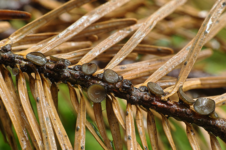 našli jsme: okolí p. n. Lipno, větev jedle v jehličnatém lese, 2020 [foto], LZ - Rutstroemia elatina – terčovka jedlová
