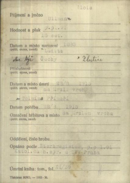 Ullmann Alois – Karta z kartotéky padlých v 1. světové válce